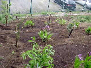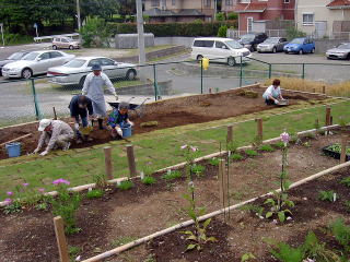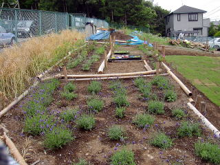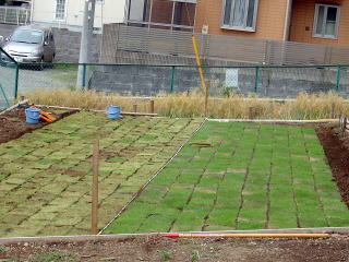 | 引き続き芝生広場の下半分に芝生貼り | 上ニ段がハーブガーデンでその下が芝生広場になります |
