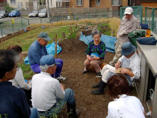 | 下の端を残して作業終了。まだ芝生は残ったので周囲や下の端まで、後に全部貼りました。 | 作業途中のお休み兼会議?の模様。実は会費を集めていました。個人はわずか年1000円です。 |