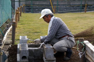 ベルトゾーンに落ちないように杭を打ち縄を張る