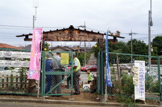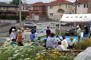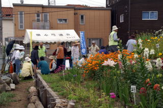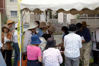 | この日もいまコミは花が満開です。 | イベントには弓道場からお借りしたテントが大活躍 |