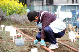 子どもたちの植えたチューリップ花壇の雑草取り
