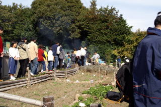 かまどをつくっての本格的焼き芋。焼く方は大変