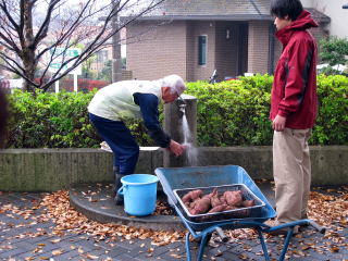焼く芋を洗っておきます