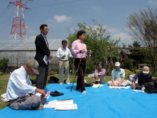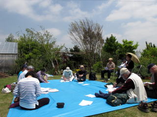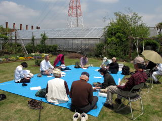 総会後、強い日差しを避けて、外の日影で三々五々昼食。