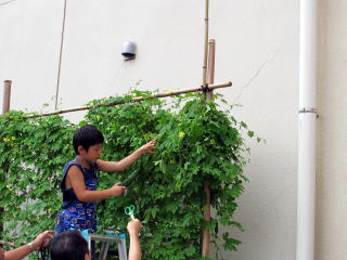 途中で会場の緑のカーテンのゴーヤを収穫。