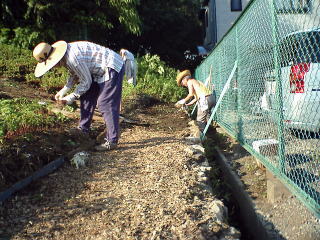 | ●9月10日 下部通路には、残っていた木片チップを再度撒く。 | ●9月10日 そばの雑草も取り、通も整備され、だいぶきれいになってきた。 |
