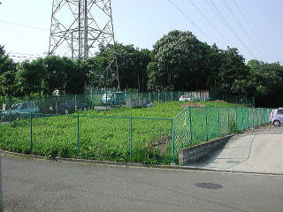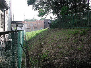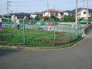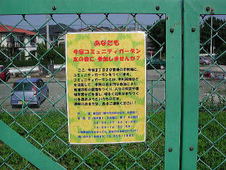 | 北側奥から南側を望む。北奥の西側上には木々があり木陰になるが、東側下は民家に隣接している。 | 周囲のフェンス4箇所に会員募集の案内をパウチにして貼りだした。 |