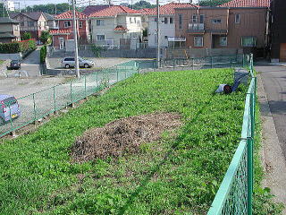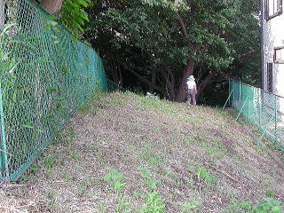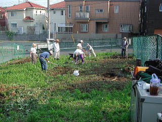 | 草を刈った後も、根までなかなか取れないため、すぐに雑草が生えて来る。 | この日は、全体会議のあと、10人で主に南側の抜根を中心に行った。しかし、クズの根はてごわい。 |