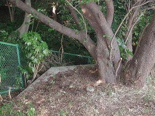 | 現地北側の幅の細い急斜面。ここをどう活用するかは大きな課題だ。 | 北側奥にある木。この木も木陰としてはもちろん何か有効活用法を考えたい。 |