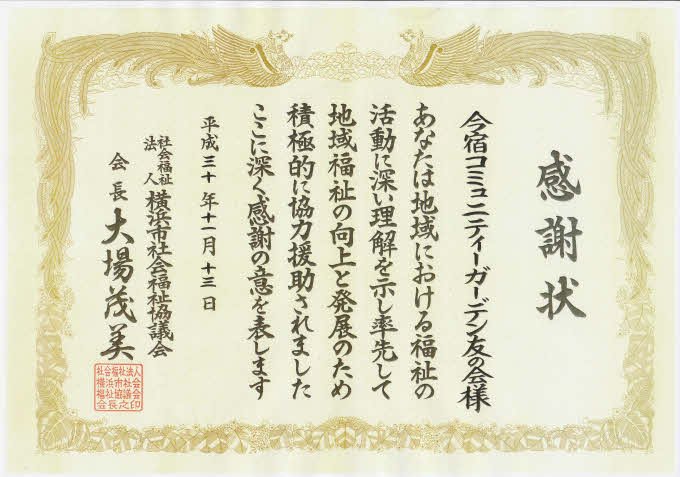 ◆2018年11月13日に開催された第38回横浜市社会福祉大会において、横浜市社会福祉協議会から、下記の感謝状が授与されました。 → こちら